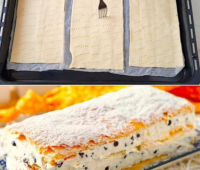 Disposer la pâte feuilletée sur une plaque recouverte de papier cuisson, écarter les trois rectangles de quelques centimètres, puis avec les dents d’une fourchette piquer délicatement toute la surface des feuilles pour éviter qu’elles ne gonflent trop au cours cuisine. Cuire au four à 200 °C pendant environ 15-20 minutes ou dans tous les cas jusqu’à ce qu’ils soient complètement dorés.