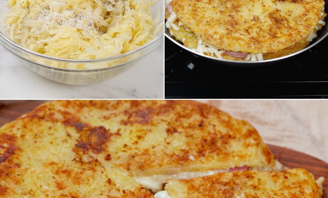Graisser une poêle antiadhésive avec un peu d’huile d’olive et couvrir le fond avec la moitié du mélange de pommes de terre.