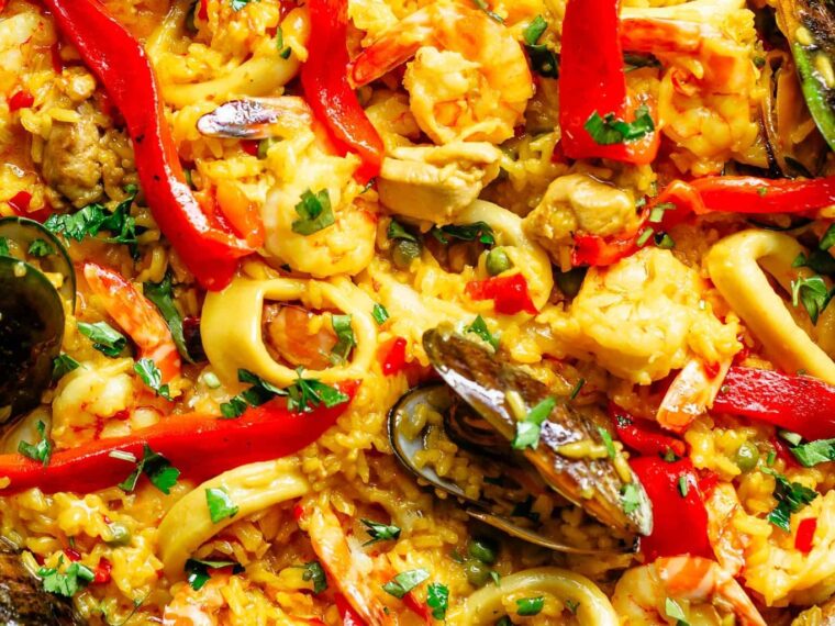 7. Servez la paella dans un plat large et peu profond, avec les fruits de mer sur le riz et la sauce de