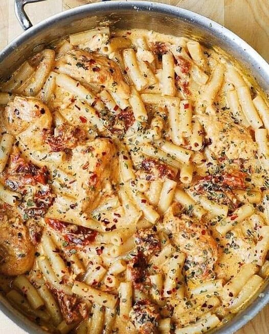 10. Assaisonner les pâtes au poulet avec du sel et plus de flocons de piment rouge, si nécessaire. Laisser mijoter quelques minutes pour que les saveurs se mélangent.