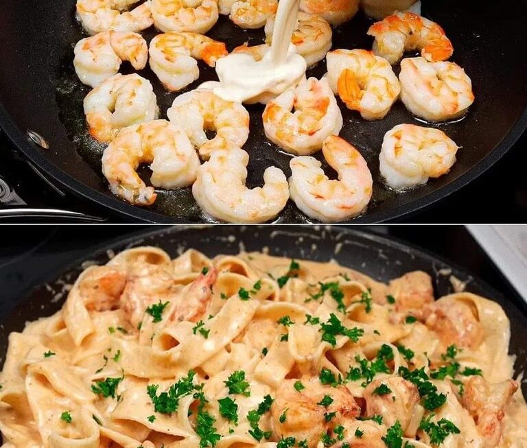 Remettez les crevettes dans la poêle et ajoutez les pâtes cuites. Mélangez bien jusqu’à ce que tout soit bien enrobé de sauce.