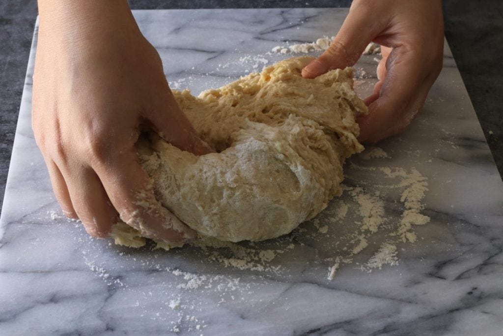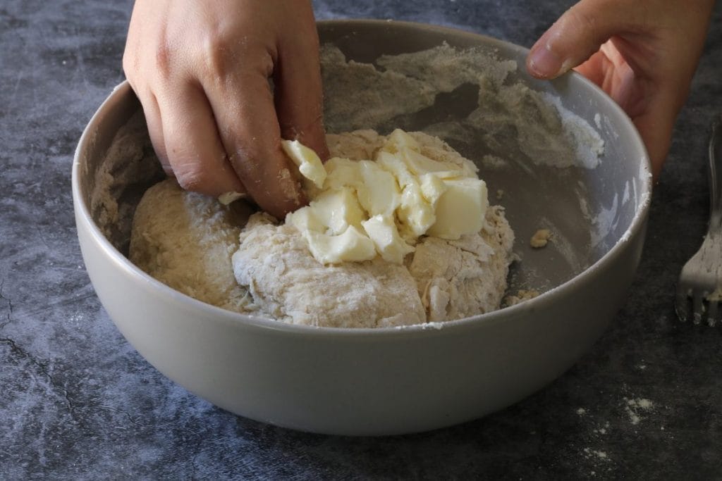 Transférer le mélange sur un plan de travail4et pétrir jusqu’à ce que le beurre soit complètement absorbé et que le mélange apparaisse lisse et élastique.