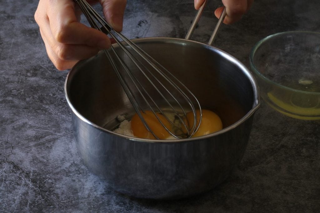 Préparez la crème pâtissière ; Récupérez l’œuf entier et le jaune dans une casserole avec la fécule de maïs et le sucre.7, puis mélangez avec un fouet.