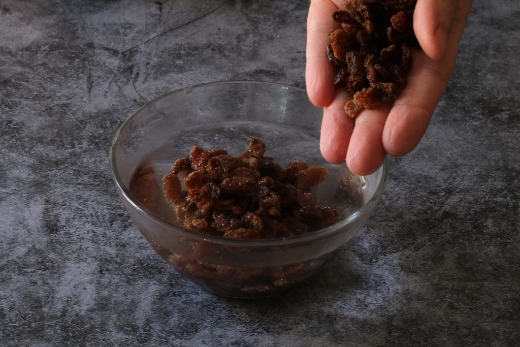 Pendant ce temps, récupérez les raisins secs dans un bol et laissez-les tremper dans de l’eau à température ambiante.6.