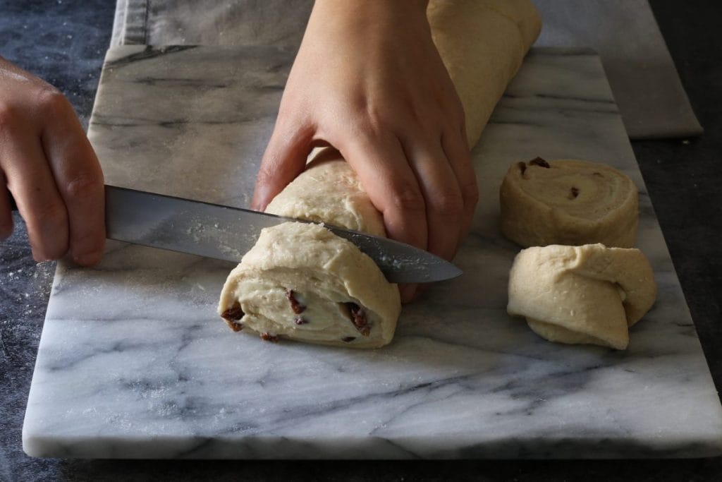 A l’aide d’un couteau bien aiguisé, coupez le rouleau en rouleaux d’environ 3 cm d’épaisseur11et disposez-les progressivement, en les espaçant, dans une plaque à pâtisserie tapissée de papier sulfurisé.