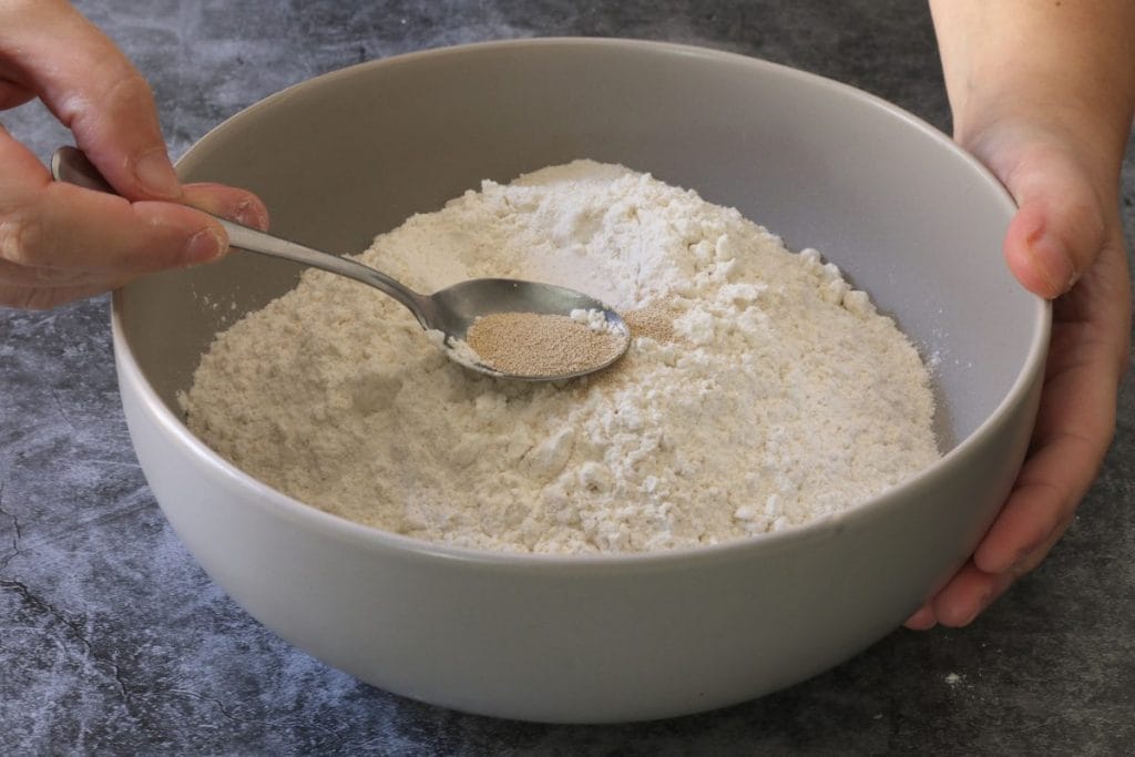Nous avons utilisé un type de levure sèche qui doit être mélangée à la farine, sans être préalablement activée dans l’eau. Pour un bon résultat, nous vous suggérons de lire la notice et de vérifier la manière d’utiliser votre levure sur l’emballage.
