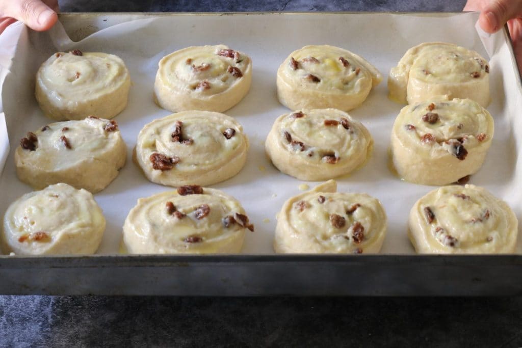 Laissez-les lever 30 minutes dans un endroit abrité12, puis badigeonnez-les d’un jaune d’oeuf battu avec une goutte de lait et enfournez dans un four statique préchauffé à 350° F pendant environ 25 minutes.