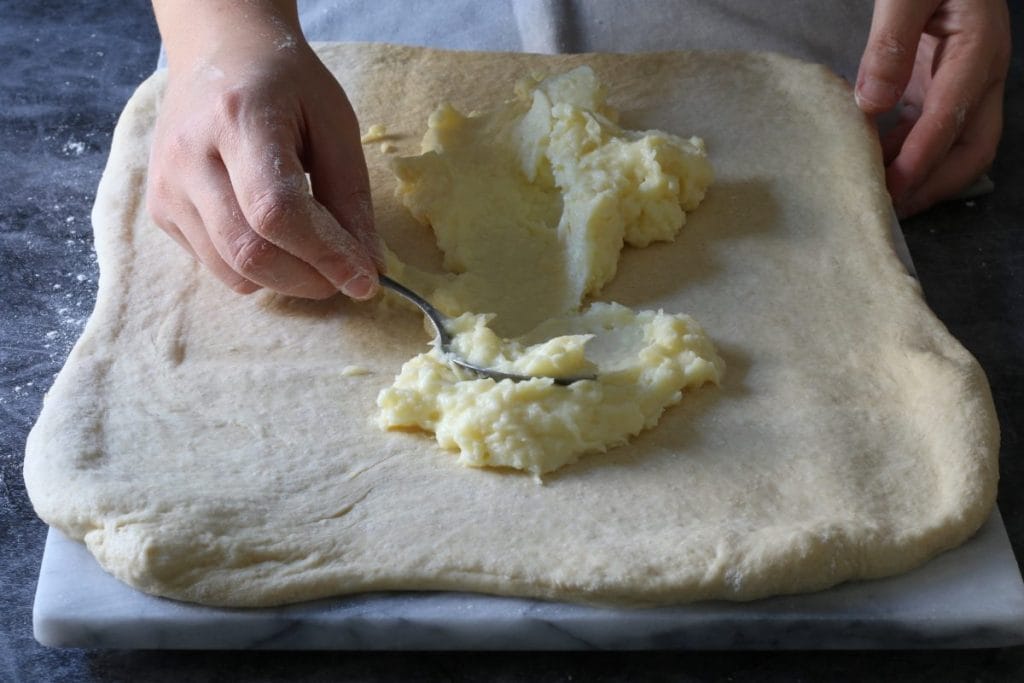 Prenez la pâte levée et étalez-la à l’aide d’un rouleau à pâtisserie sur un plan de travail fariné en essayant d’obtenir un rectangle. Farcissez-le ensuite avec la crème pâtissière à température ambiante9.