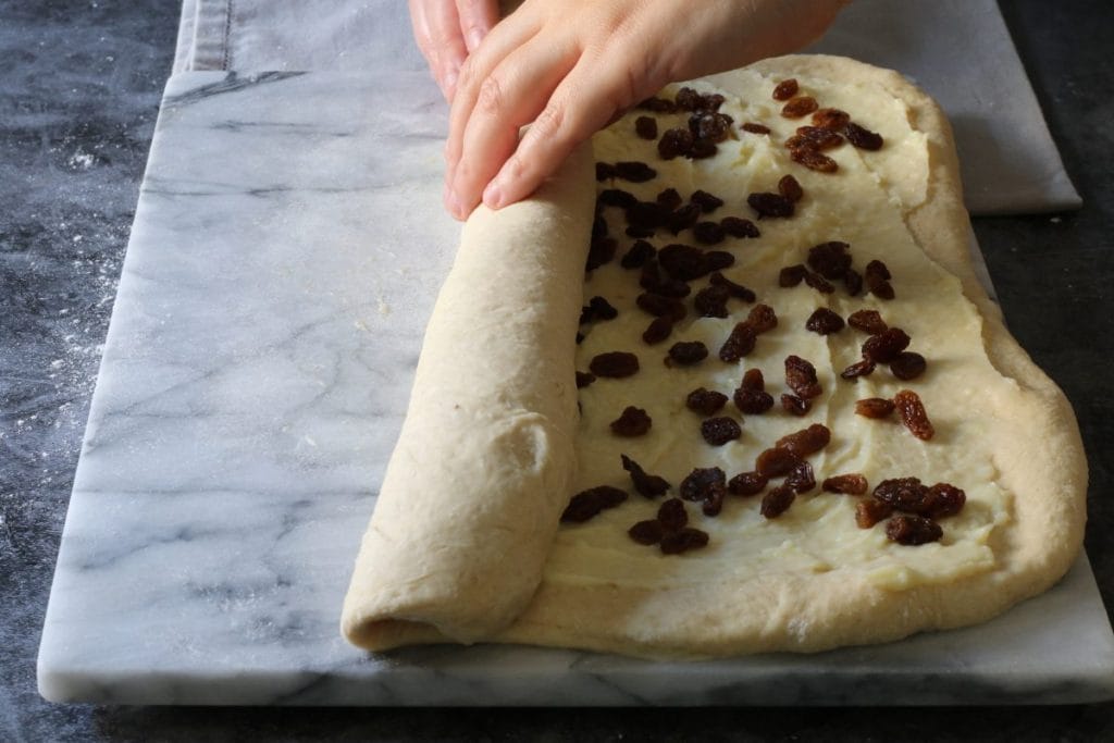 Pressez les raisins secs, tamponnez-les avec du papier absorbant et répartissez-les sur la couche de crème. Puis, en partant du côté long du rectangle de pâte, former un rouleau très serré.dix.