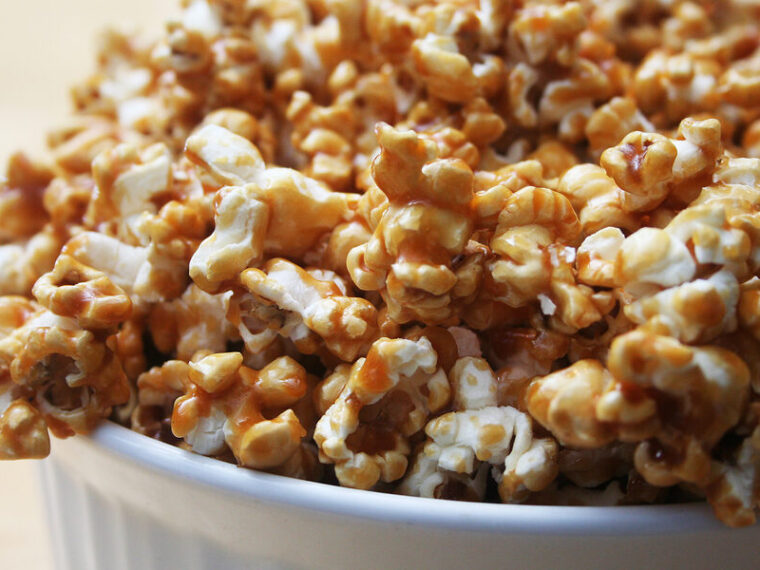 4. Déposer le maïs soufflé dans un bol, verser le caramel puis bien mélanger le tout à l’aide d’une spatule (attention, c’est chaud !)