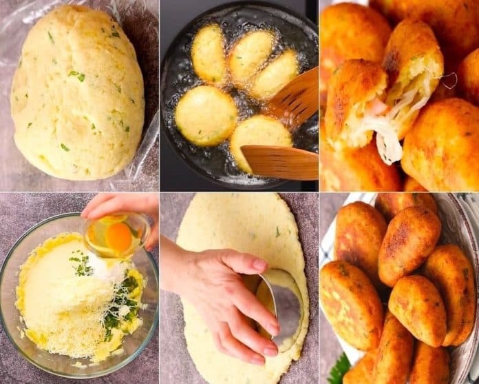 Faire bouillir et écraser les pommes de terre. Ajouter la semoule, le fromage, le sel, le poivre, le persil, la levure chimique et l’œuf.
