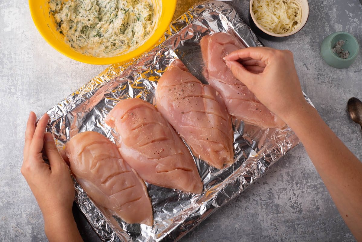 Placer le poulet sur une planche à découper et faire des fentes sur un côté de chaque poitrine de poulet. Assurez-vous de ne pas couper complètement le poulet, car vous ne voulez pas que la garniture tombe. Saupoudrer chaque poitrine de poulet de sel et de poivre de tous les côtés et transférer sur la plaque à pâtisserie préparée.