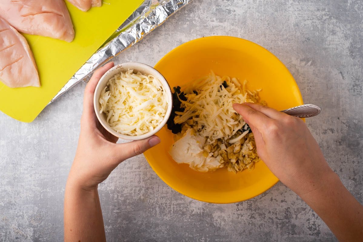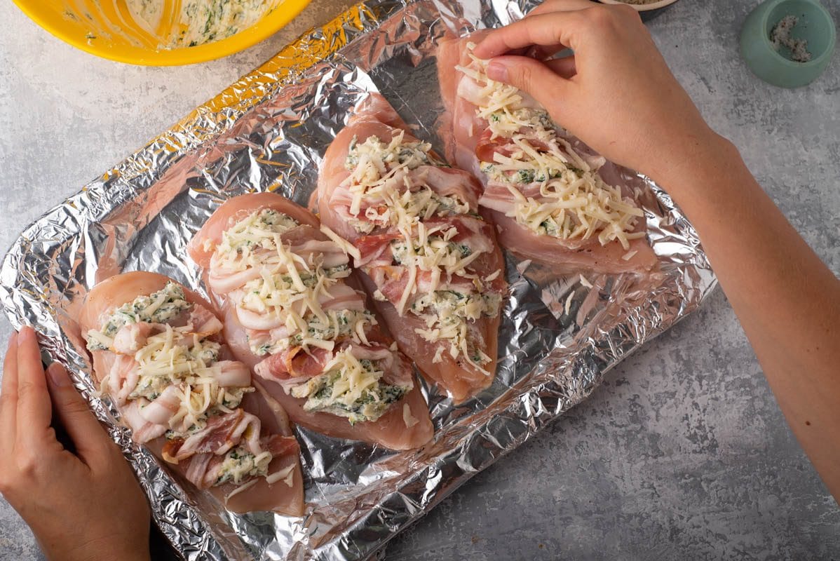 Placer le poulet sur une plaque à pâtisserie et combiner tous les ingrédients de la garniture dans un bol à mélanger. Ensuite, répartissez le mélange de garniture entre chaque fente du poulet. Enfin, faites cuire les poitrines de poulet jusqu’à ce qu’elles soient complètement cuites et que le fromage soit fondant et doré.