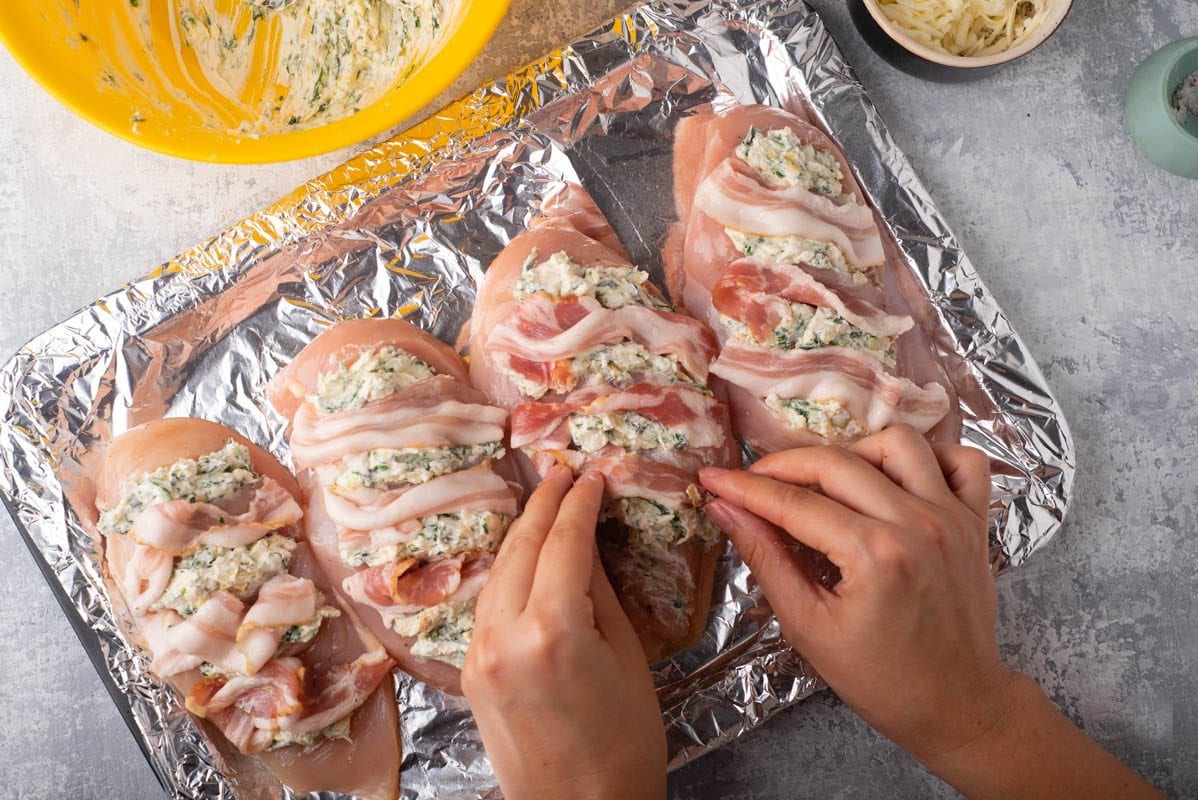Après avoir assemblé les poitrines de poulet farcies au bacon sur une plaque à pâtisserie (tapissez-la de papier parchemin pour faciliter le nettoyage plus tard), faites cuire le poulet dans un four à 400 ° F pendant environ 35 minutes. Le poulet est cuit lorsqu’il enregistre une température interne de 165°F.