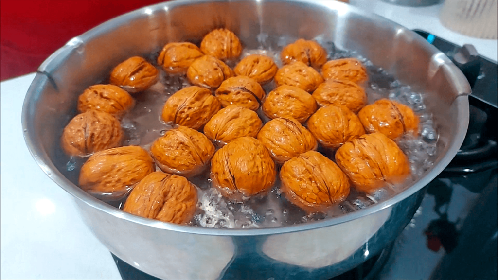 Faites bouillir 120 grammes de noix entières avec leur coquille pendant 5 minutes jusqu’à ce qu’elles soient légèrement ramollies.
