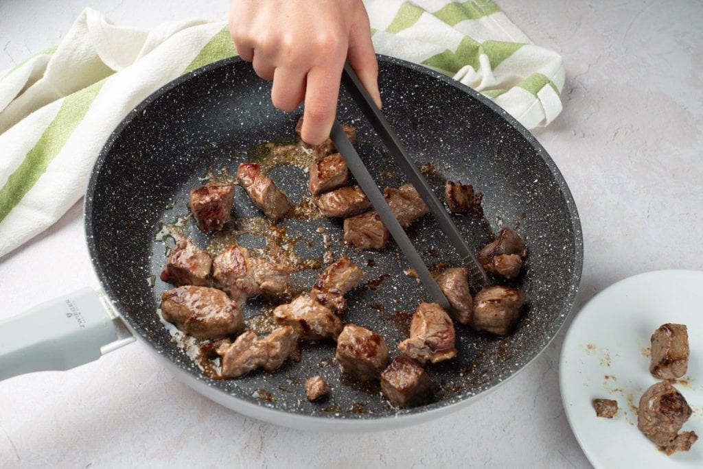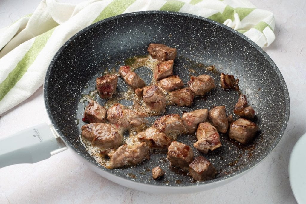 Faites chauffer une cuillère à soupe d’huile d’olive dans un faitout. En travaillant par lots, dorer le bœuf à feu moyen-vif de chaque côté. Ne surchargez pas la poêle lorsque vous dorez le bœuf. Ajouter plus d’huile entre les lots au besoin.