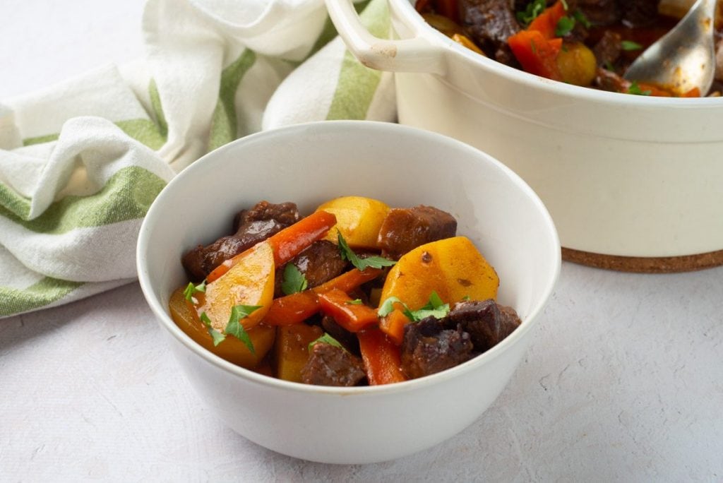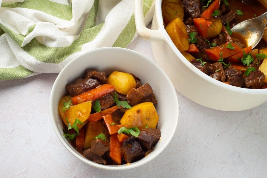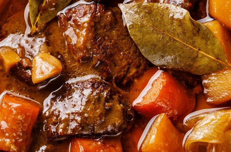 Ce ragoût de bœuf simple, copieux et sain est tout à fait irrésistible grâce aux succulents morceaux de bœuf fondant dans la bouche , aux pommes de terre tendres et aux carottes cuites lentement dans un mélange paradisiaque de vin rouge, de bouillon de bœuf, d’herbes et de légumes aromatiques. . C’est une recette fabuleuse à faire les soirées fraîches ou chaque fois que vous souhaitez préparer un dîner réconfortant et robuste.