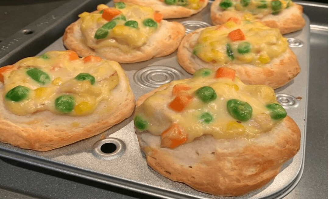 À l’aide d’une cuillère, verser le mélange de poulet dans chaque fente à muffins tapissée de croissants, en la remplissant aux 3/4 pour éviter tout débordement.