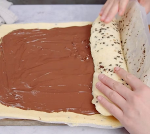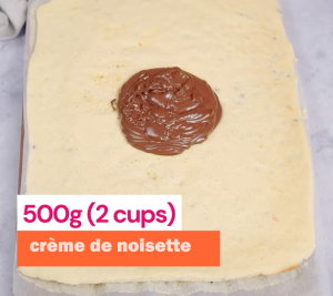 Étaler la pâte de noisette sur le dessus du chaud (pas besoin que le gâteau refroidisse au préalable).