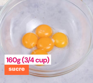 Mettre les jaunes d’œufs dans un bol propre et ajouter le sucre.