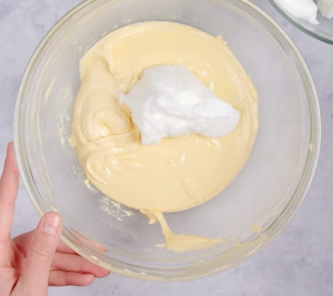 Incorporer délicatement les blancs d’œufs battus dans la pâte, en veillant à ne pas trop mélanger.