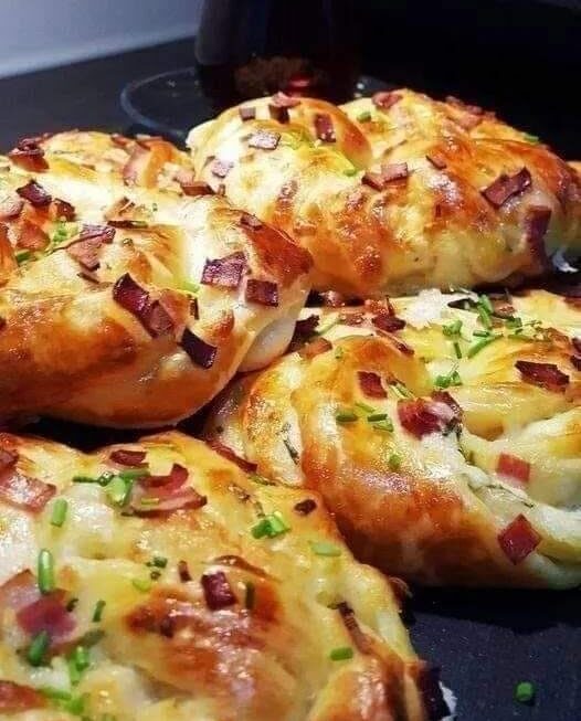 4- Aplatir la pâte en une forme ovale, la remplir avec la garniture au fromage et à la ciboulette et l’enrouler dans le sens de la longueur. Fermez maintenant le rouleau aux extrémités et tournez une ou deux fois. Ensuite, tordez-les en une sorte de nœud ou rapprochez les extrémités.
