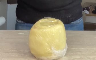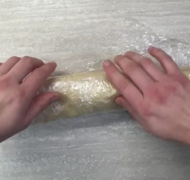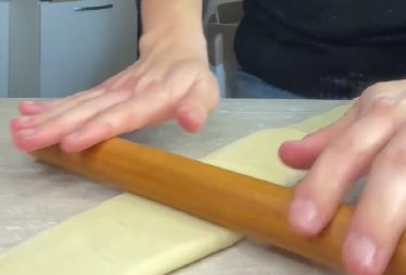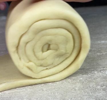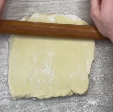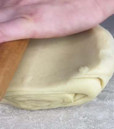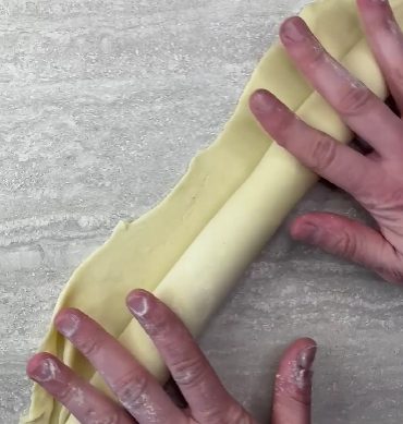 Luego enrolla todo de nuevo7. Este hojaldre rápido ya está listo, envuélvelo8y dejar reposar 30 minutos en la nevera. Después de reposar, estirar la masa con un rodillo.9hasta que tenga aproximadamente medio centímetro de espesor.