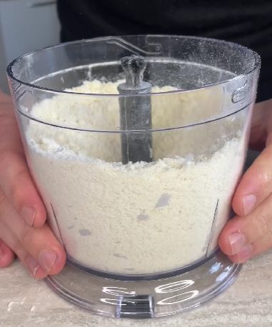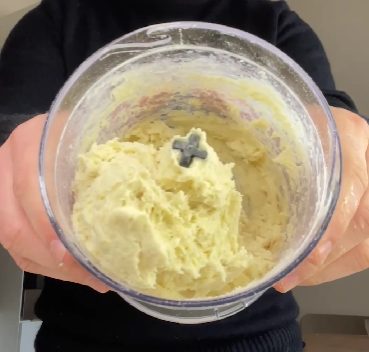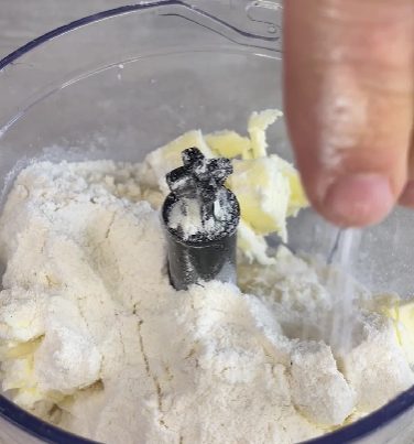 Para estos rollitos hacemos una especie de hojaldre rápido: ponemos en un robot de cocina la mantequilla fría, la harina y una pizca de sal.1y licuar por unos segundos2: hay que utilizar el robot porque la masa se calentaría demasiado con las manos. Agrega el agua fría y licúa nuevamente hasta obtener una mezcla bien integrada.3.