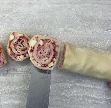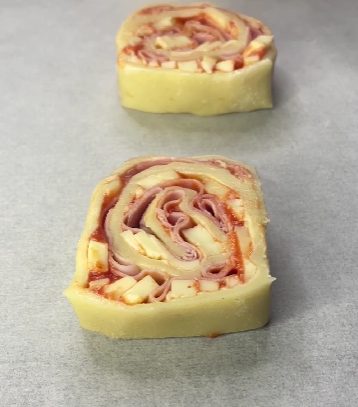 Sazonez la pâte avec de la purée de tomate sazonée, un peu de mozzarella pour la pizza et enfin le jambon cuit.10. Enrollar todo bien y cerrar con film transparent.11y dejar compactar en el congelador durante al menos 30 minutos. Ensuite, coupez les rouleaux avec un couteau afilado.12.