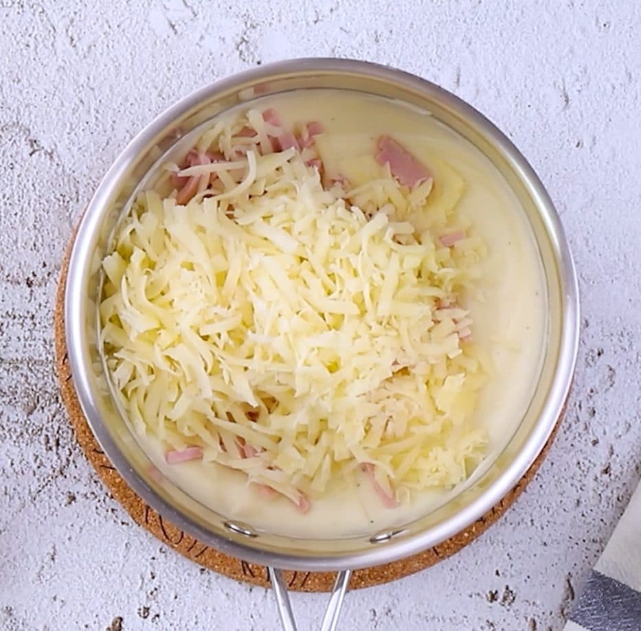 Retirez la casserole du feu. Ajoutez le jambon et le fromage et remuez avec une spatule pour combiner tous les ingrédients.