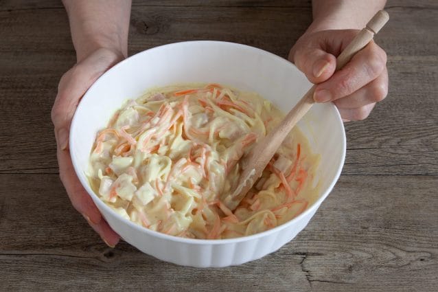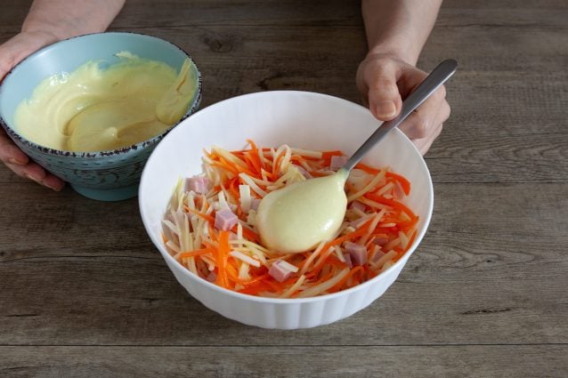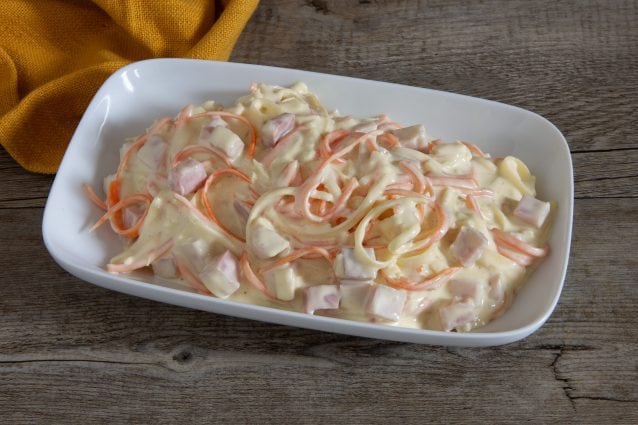 La salade capricciosa est un plat simple mais très savoureux, typique de la cuisine piémontaise. Une entrée festive à base de carottes et de céleri-rave coupés en julienne, de dés de jambon cuit et de lamelles de fromage, richement assaisonné d’une délicieuse sauce obtenue en mélangeant de la mayonnaise à de la moutarde douce.