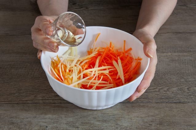 Égouttez les légumes et transférez-les dans un grand bol; puis verser le vinaigre3et assaisonner de sel.