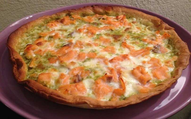 Une fois retirée du four, laisser le four allumé et ajouter la crème fraîche, les oignons coupés en rondelles, ainsi que les tranches de saumon, du poivre ( généreusement ) et du sel, et saupoudrez de fromage rappé.