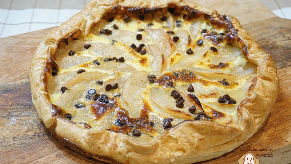 Quelques pépites de chocolat viennent ensuite habiller cette tarte aux poires.