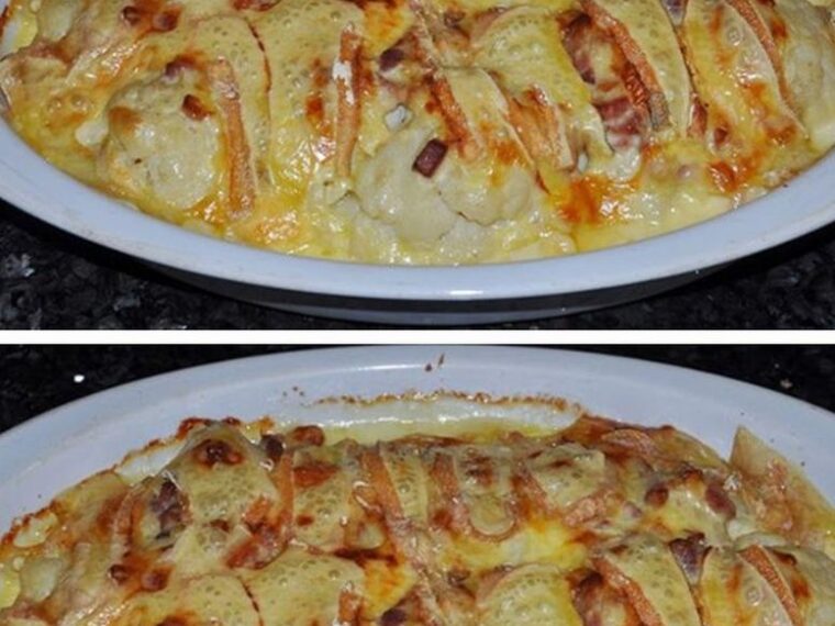 Le chou-fleur doit être soigneusement placé dans un plat à gratin, puis le mélange oignon-bacon-crème soja doit être versé dessus. Pour finir, ajouter une couche de tranches de reblochon.