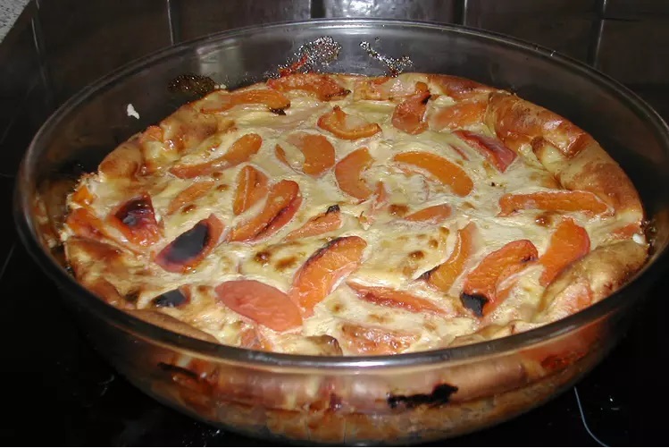 Étape4 – Beurrez un moule à manqué. Répartissez les morceaux d’abricots sur le fond et recouvrez-les avec la préparation. Enfournez 40 minutes environ
