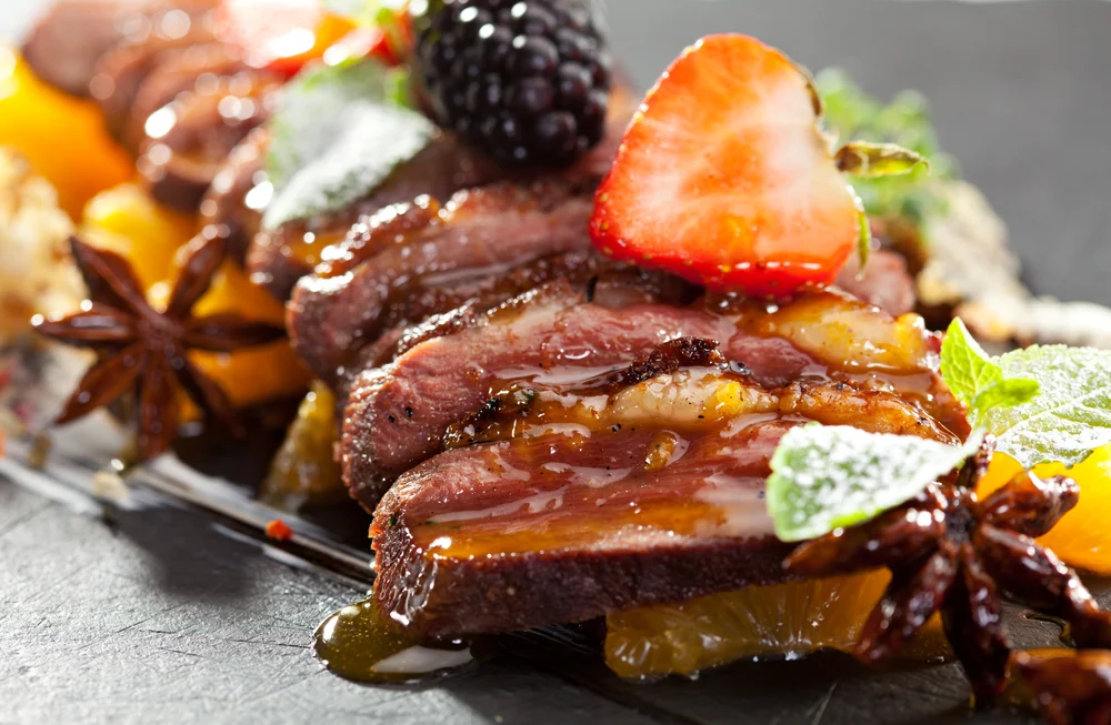 Etape7 : Ajoutez alors les mûres et réchauffez. Coupez les magrets en tranches et servez avec la sauce aux mûres et disposer quelques mûres fraiches par dessus pour la décoration.