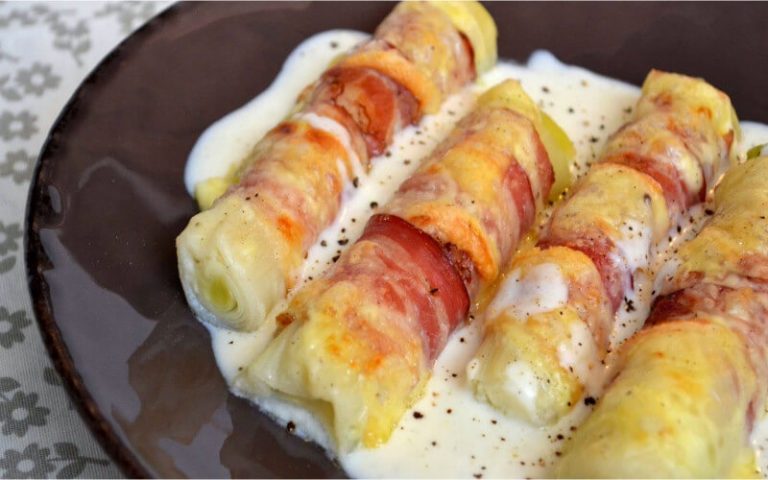 Versez la sauce béchamel dans le fond d’un plat à gratin, entourez les poireaux avec le lard fumé et placez-les sur la sauce. Recouvrez les poireaux avec des morceaux de fromage à raclette et enfournez 10 minutes à 180°C. Passez sous le grill pour faire dorer le fromage si nécessaire. Servez immédiatement en donnant un tour de moulin à poivre si vous aimez.