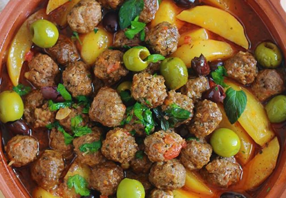 Etape5: Ajouter les morceaux de pommes de terre, les boulettes de viande et les olives dans la sauce tomate. Saler et poivrer légèrement (attention au sel car les olives sont déjà salés). Parsemer avec le reste des herbes aromatiques.