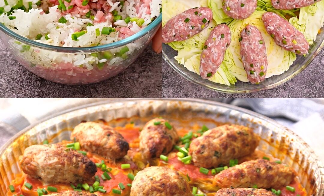Dans la farce, mettre les oignons râpés, les oignons verts, le sel, le poivre, le riz (cuit jusqu’à mi-cuisson). Mélanger. Former des boulettes de viande et les déposer sur le chou.