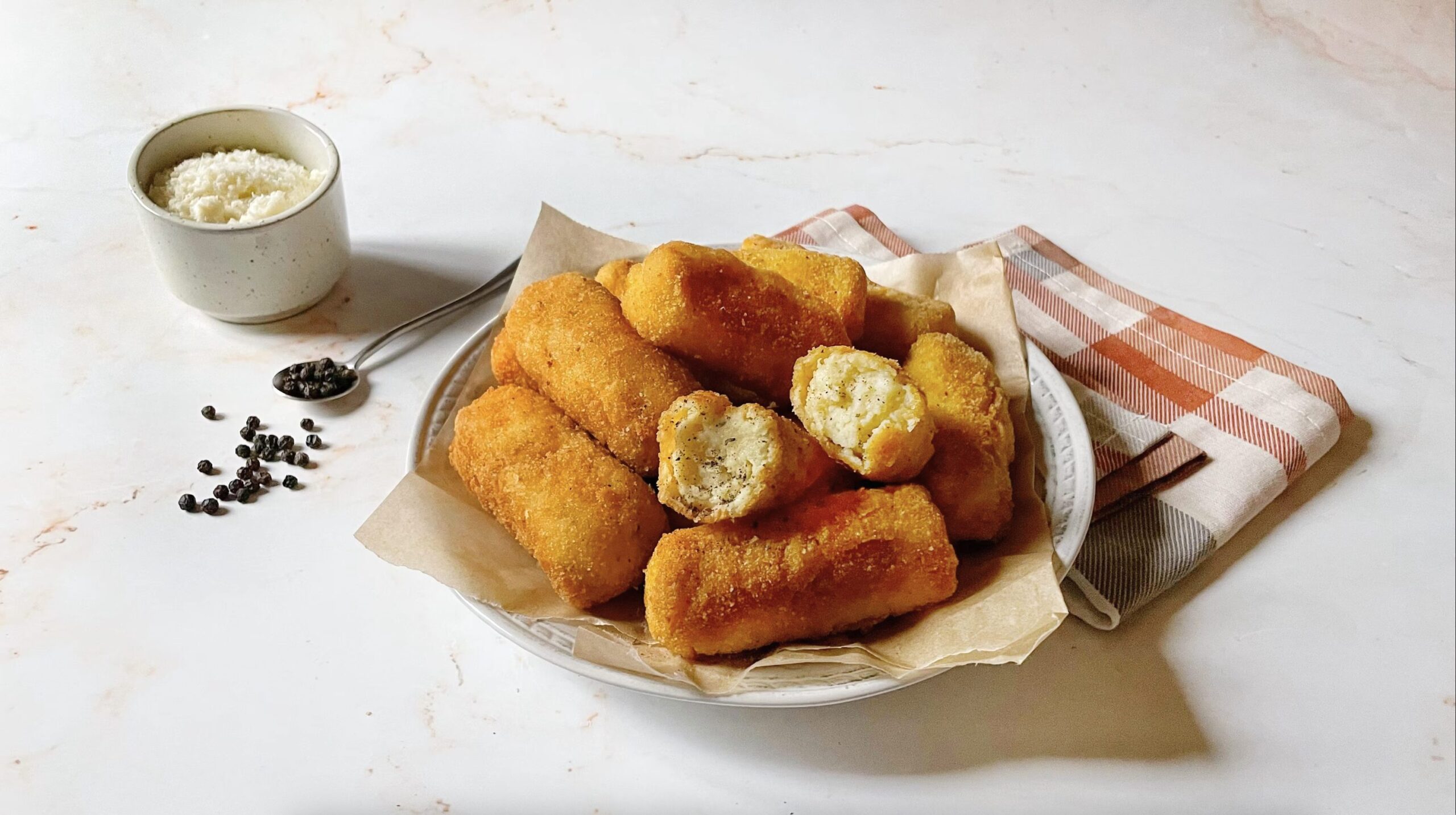Les croquettes Cacio e pepe sont la variante la plus riche des croquettes de pommes de terre classiques. Une recette inspirée du goût du célèbre premier plat de la cuisine romaine à base de pecorino râpé et de poivre fraîchement moulu, idéale à apporter à table comme apéritif pour un déjeuner ou un dîner entre amis.