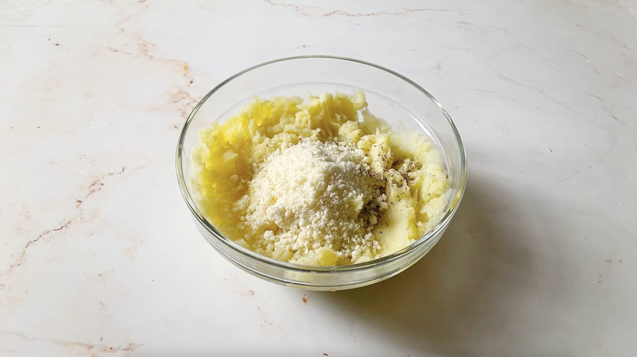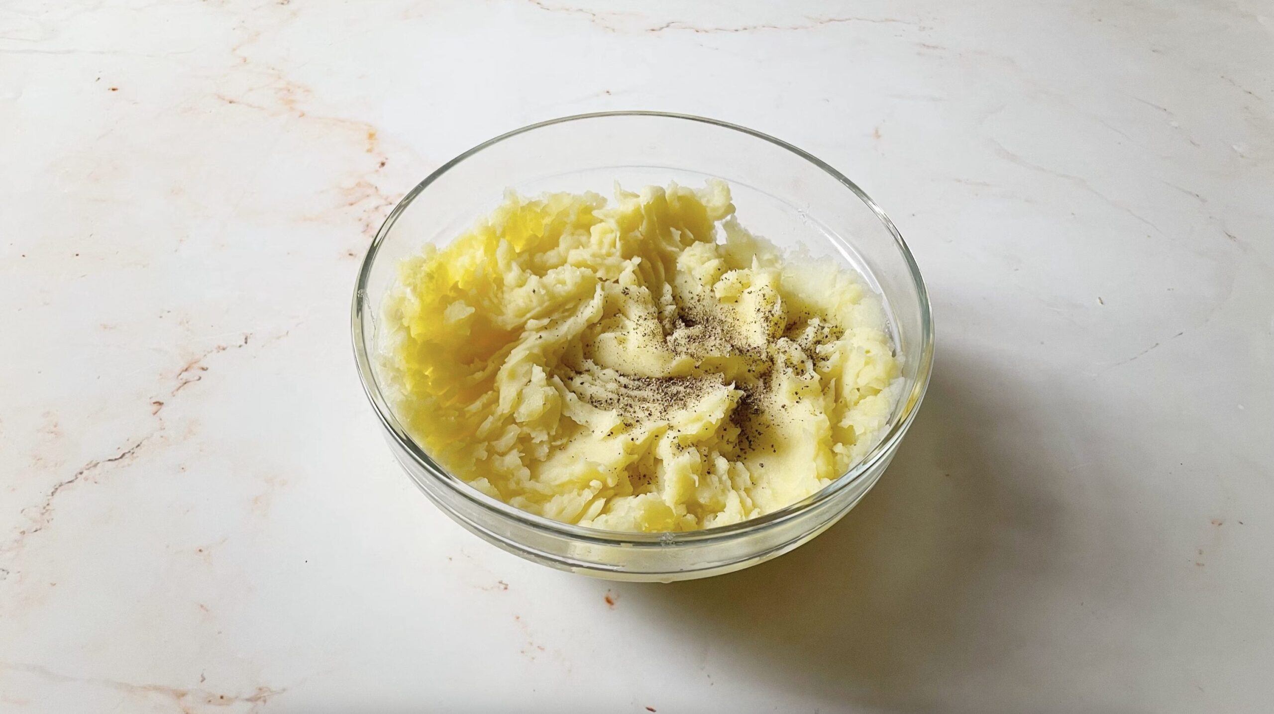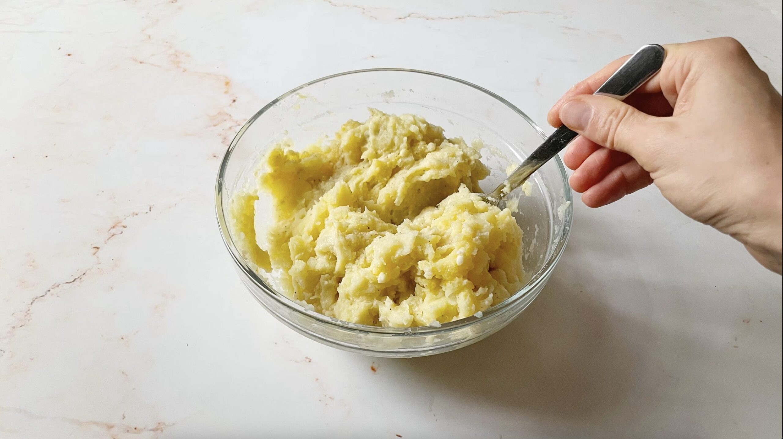 Une fois le temps écoulé, égouttez les pommes de terre, laissez-les refroidir légèrement et épluchez-les ; puis récupérez-les dans un bol et réduisez-les en purée avec les dents d’une fourchette.