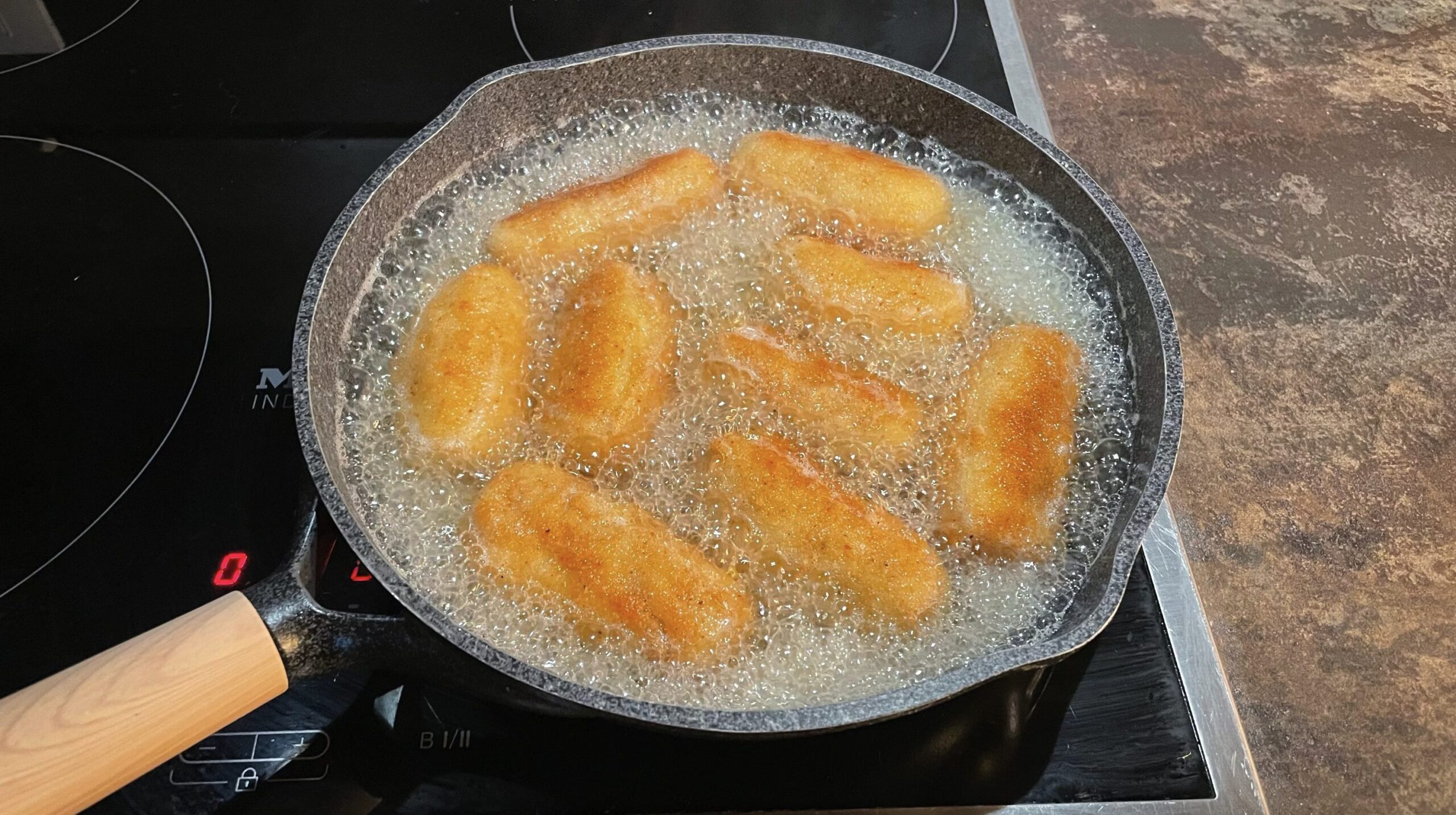 Trempez ensuite les croquettes dans beaucoup d’huile de graines bouillante et faites-les frire jusqu’à ce qu’elles soient dorées.