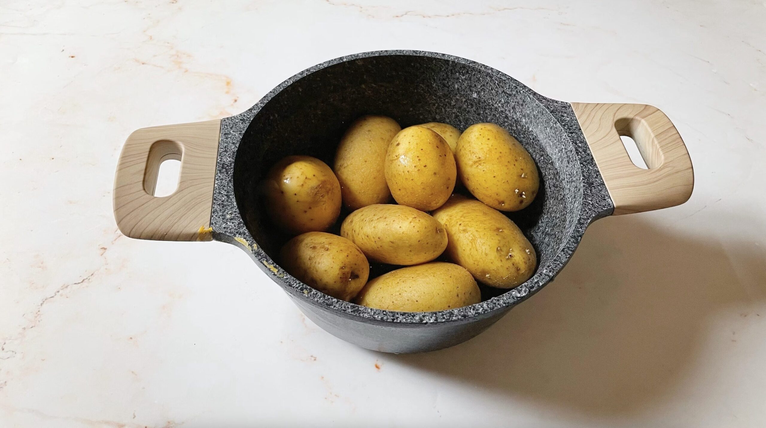 Mettez les pommes de terre dans une grande casserole, couvrez d’eau froide et laissez cuire environ 40 minutes à partir de l’ébullition.