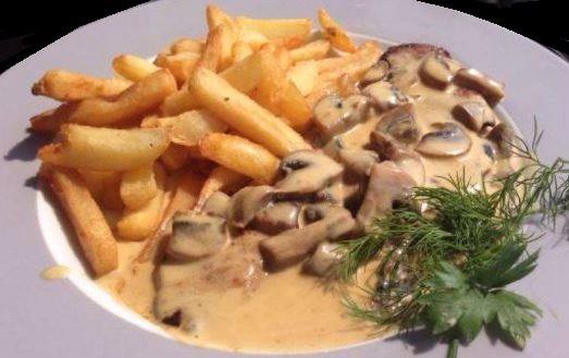 Escalope de veau avec de la crème fraiche, des champignons, parfois du calva (Calvados)..