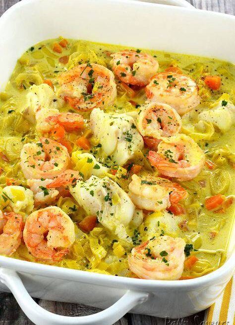 Recette de ragout de cabillaud et crevettes à la crème style waterzooï, poisson et fruits de mer brièvement pochés, servis avec carottes, poireaux, sauce crémeuse. Facile et rapide, un délicieux repas ou une belle entrée si vous recevez!