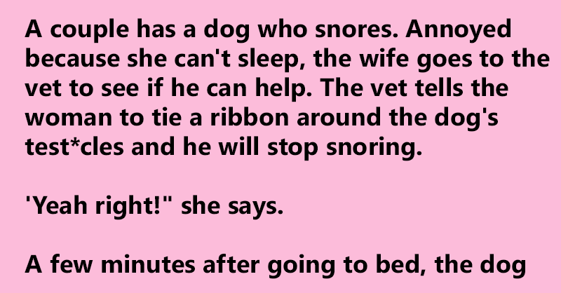 A couple has a dog who snores. Annoyed because she can’t sleep, the wife goes to the vet to see if he can help. The vet tells the woman to tie a ribbon around the dog’s test*cles and he will stop snoring.